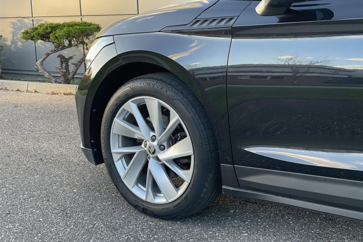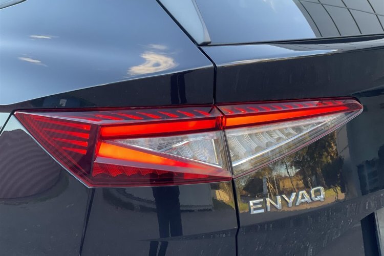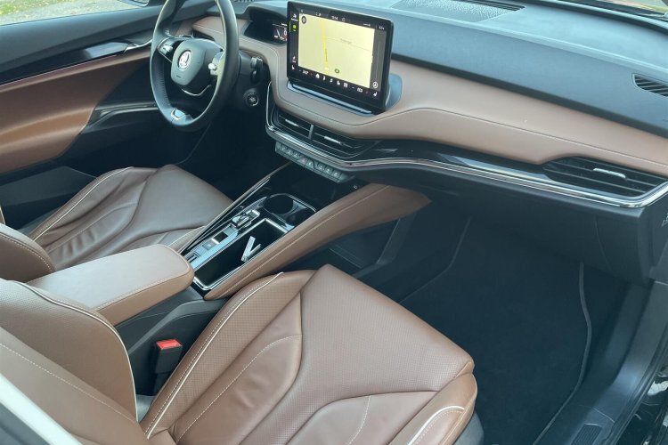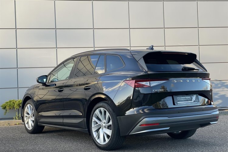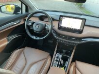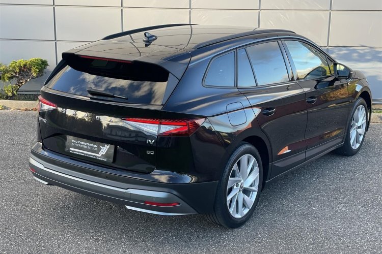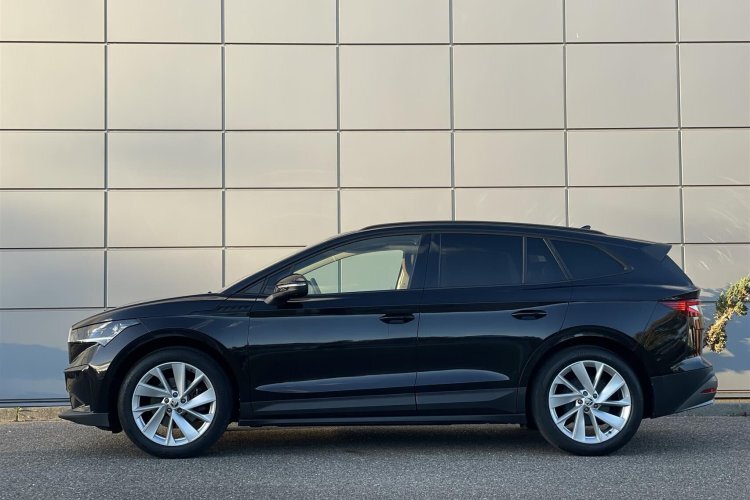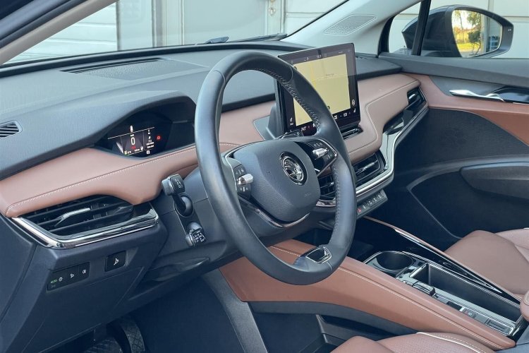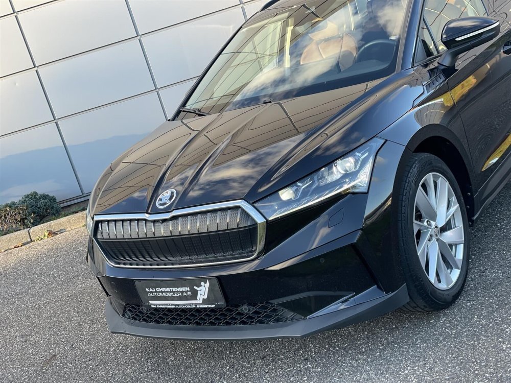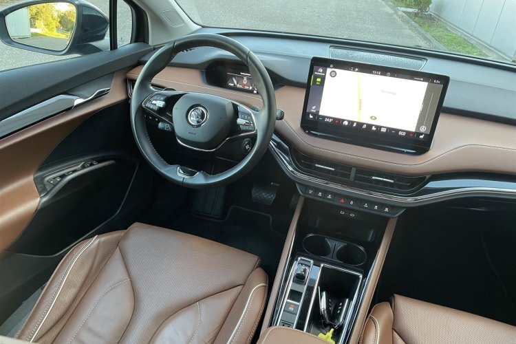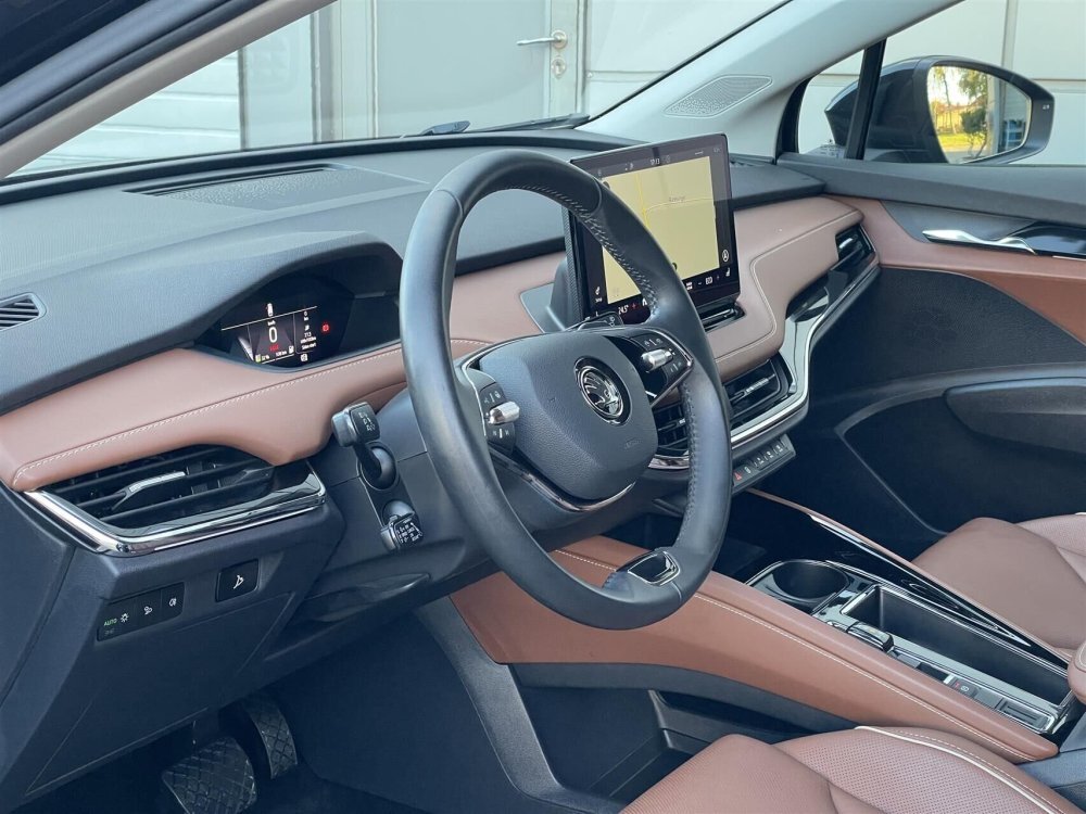 Velholdt Skoda Enyaq her i den elegante farve kombination sort Metallic lakering med brun læder interiør.