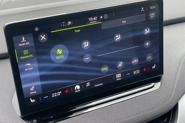 elektrisk kabinevarmer med styring via app, navigation, apple carplay, android auto, håndfrit til mobil, dab+ radio, musikstreaming via bluetooth, kørecomputer, splitbagsæde, ambiente belysning, læderrat, 19" alufælge, el-klapbare sidespejle m/varme, kurvelys, tagræling, tågelygter, mørktonede ruder i bag, automatgear, udv. temp. måler, 4x el-ruder, varme i rat, alarm, træthedsregistrering, airbag, esp, blindvinkelsassistent, automatisk lys, bakkamera, parkeringssensor (for), parkeringssensor (bag), regnsensor, dæktryksmåler, skiltegenkendelse, isofix, fjernlysassistent, vognbaneassistent.