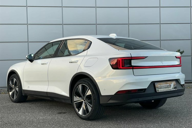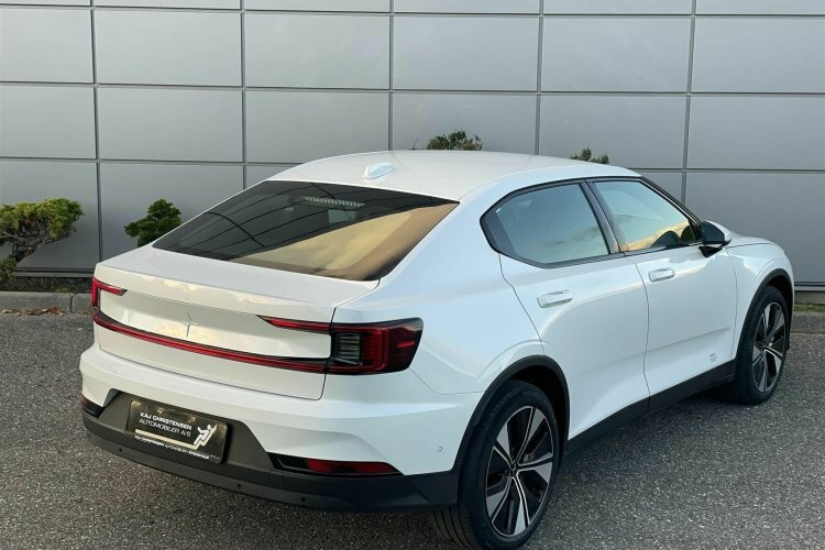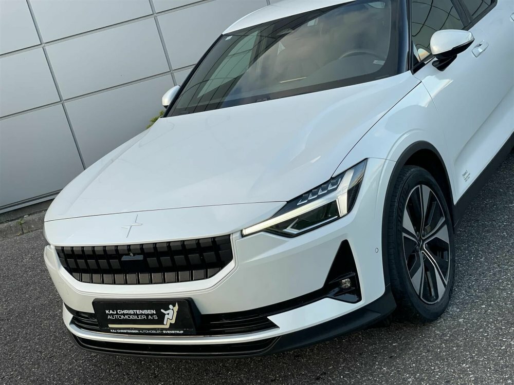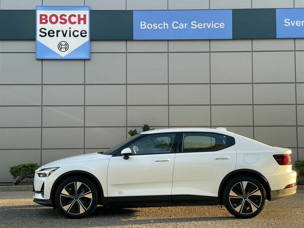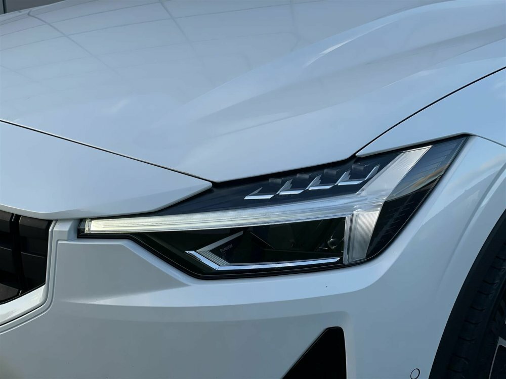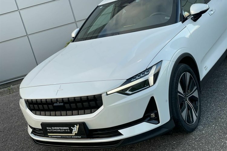 Pæn og velholdt Polestar 2. Her i den flotte snow pearl metallic lakering.