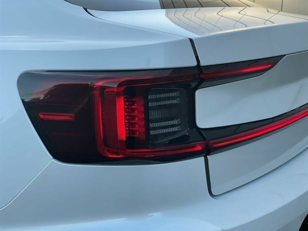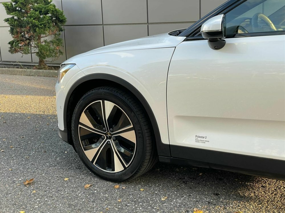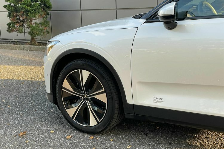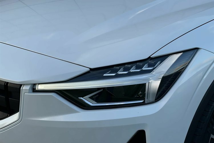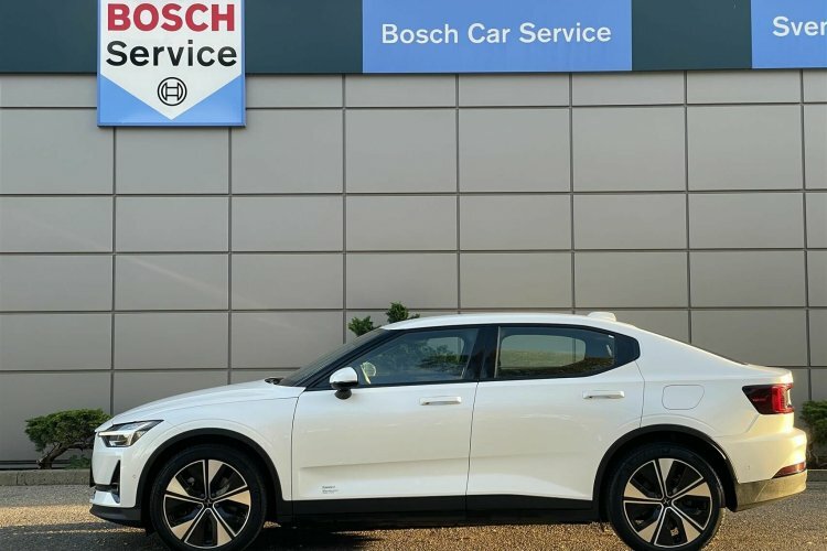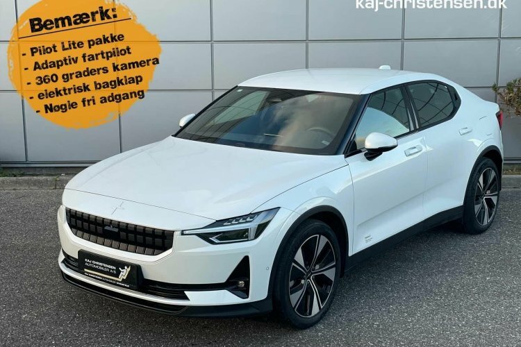 Pæn og velholdt Polestar 2. Her i den flotte snow pearl metallic lakering.